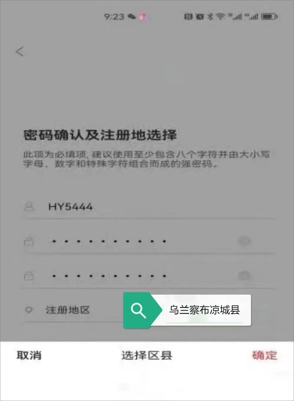 3、注册时,填写密码→选择注册地区(下图为示例)