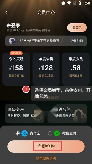 在会员中心选择会员类型和支付方式,完成支付解锁会员。
