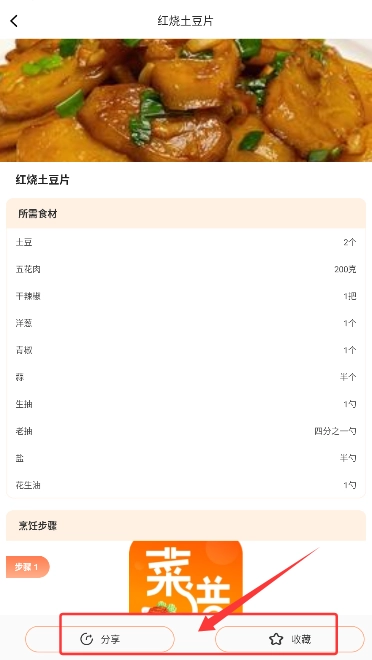 4、进入如"红烧土豆片"等具体菜谱页面,可查看详细制作流程并收藏分享。