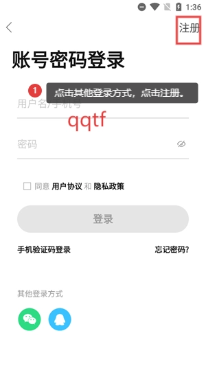 在登录界面点击其他方式登录,点击右上角的注册功能。