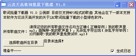 云淡天高歌词批量下载器是一款比较受欢迎的批量下载歌曲对应歌词LRC文件的下载器。软件仅支持所有mp3软件,采用百度服务器,通过远程访问的方法抽取并下载。