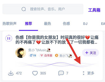 2、当找到实用的铃声音频后,点击播放,此时下方会出现拓展栏目,接着点击该栏目中的更多选项。