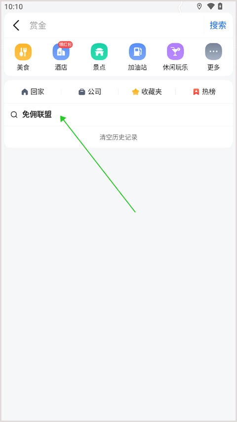 2、在已打开的搜索页面的搜索框中,输入【免佣联盟】字样。因为小编此前搜索过,所以下方会出现搜索记录。