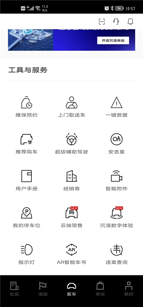 3、点击进入爱车页面,在此处,平台为用户准备了丰富多样的工具与服务,用户能够开展维保预约、一键救援以及上门取送车等操作。