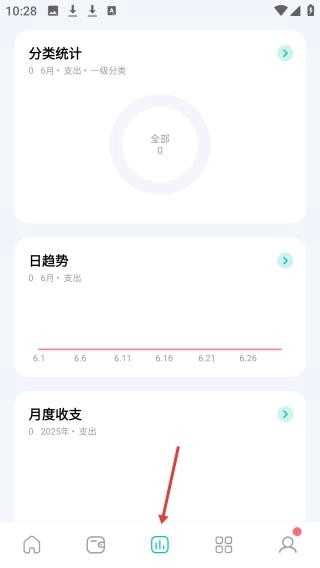1. 在分类统计界面,能够查看支出构成、每日消费趋势以及各月的收支概况。