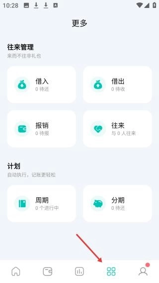 2. 进入“更多功能”页面,便能使用借入借出记录、周期性计划、分期管理等模块。