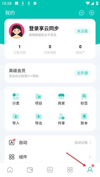3、进入“我的”页面,在这里,你不仅能够查看累计记账天数,还可以开启云端同步功能、升级为高级账户,以及对分类标签等个性化服务进行管理。