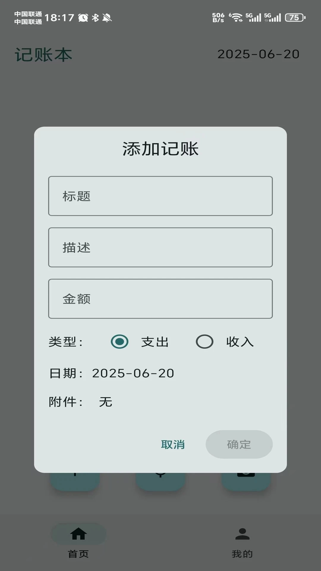 2. 在记账添加页面,依次输入标题、描述与金额,选好类型后,点击确定就能完成添加。