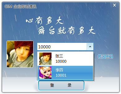 GIM企业即时通讯是采用.NetFramework4.0+SQL2008R2开发的一套企业内网/外网通用的即时通讯(IM)软件,分为服务器端和客户端,通讯使用UDP/TCP底层开发。界面高仿QQ2013,主要功能包括:即时消息、离线消息、消息字体设置、图片表情、抖动窗口、手写板、屏幕截屏、文件批量传输、消息管理、个性头像、个性昵称和服务器端组织机构、人员管理等功能。后续会逐渐添加群组聊天、语音聊天、视频聊天等功能。