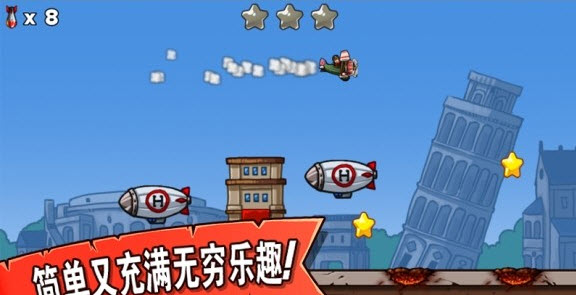 疯狂大轰炸是一款基于物理引擎的动作解谜游戏。游戏简单而有乐趣,主要利用炸弹去炸掉障碍物,但是要很好掌控飞机燃料,要不很容易坠机。随着关卡加深而难度不断增强。