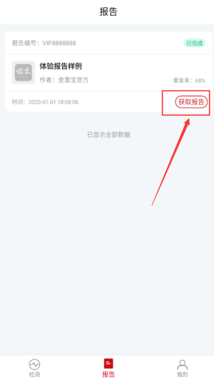 2. 点击红色方框,获取报告及详细的查重结果文档。