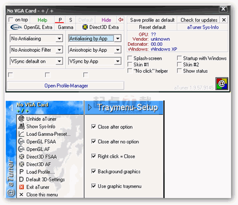 aTuner是德国硬件网站3DCenter.de释放出的nVIDIA显示卡调节工具。该软件是单独可执行文件,下载后无需安装,身材苗条,最新版的也仅有330KB。它可以对nVIDIA GPU的反锯齿、各项异性过滤、垂直刷新同步和MipMap LOD进行调节。软件在启动的时候会要求你打开4x全屏抗锯齿(到现在我也不理解有什么意义),软件界面非常简单,所有功能都包含其中。在常用的项目中有OpenGL的全屏抗锯齿、各项异性过滤、垂直刷新同步、MipMap LOD和D3D的全屏抗锯齿、各项异性过滤、垂直刷新同步、MipMap LOD调节项目。总的来说,这款软件虽然不像RivaTuner的功能那么强大,但是它还是提供了最常用的调节选项,是一款非常实惠的软件
