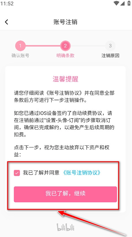 4. 首先勾选“我已了解并同意账号注销协议”,随后点击“我已了解,继续”。
