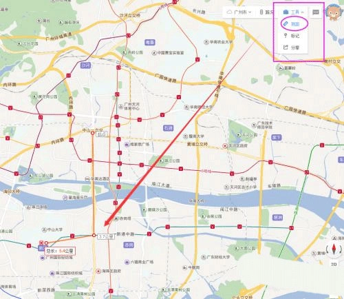 4、进入百度地图网页,点击右上角的“工具”选项中的“测距”功能,如此便能在百度地图上借助点与点的连接来测量两点间的距离。