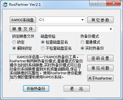 RAMOS伴侣 RosPartner是一款非常好用的RAMOS热备份工具,RAMOS伴侣可以将ramos系统下的系统盘文件完整的备份保存,有需要的朋友们赶快来下载吧。