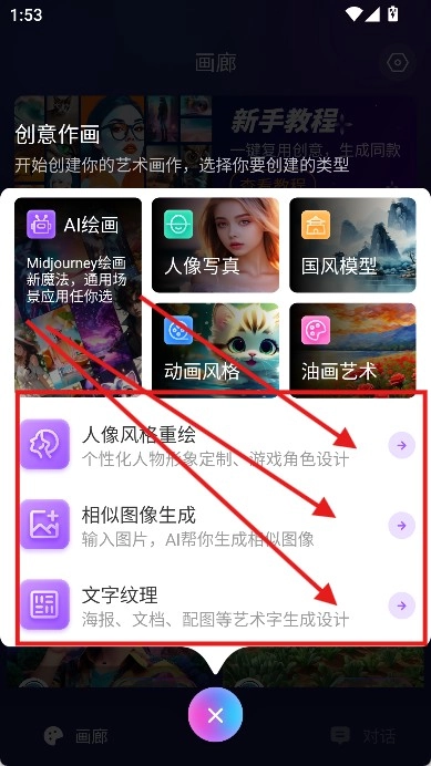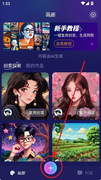 1. 开启Midjourney绘画,轻点首页底部的【+】号按键,从而进入创作页面。