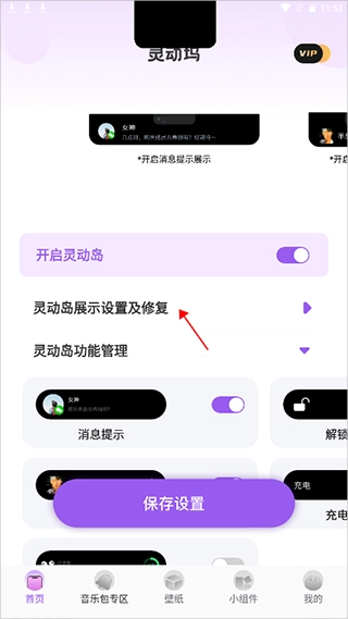 1. 用户启用灵动坞软件的灵动岛功能后,能够在软件首页点击【设置及修复】按钮。