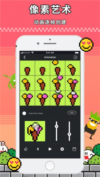 海量像素动画素材,动画功能能够支持24帧动画,每帧皆可单独编辑,速度亦可调节。