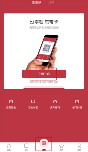 1、在乘车页面里,用户点击“立即开启”按钮。
