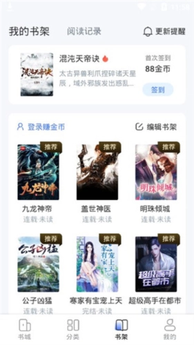 3、点击进入书架,用户能够把自己喜爱或者打算入手的书籍存放在这里,便于下次继续追书。