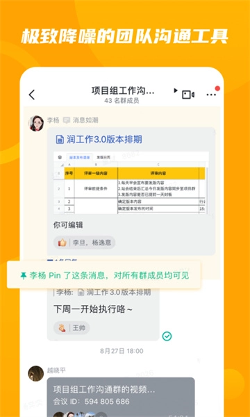 3、拥有畅快无阻的沟通工具,重要消息能够加急传达,日程与文档可随时通知,协作信息及时同步。
