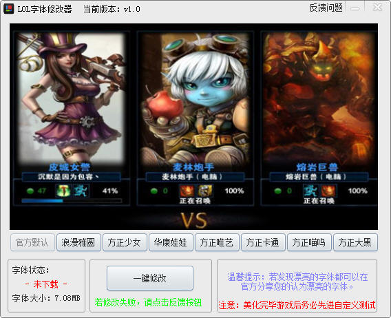 玩家可以通过该LOL字体修改工具将游戏字体修改成官方默认、浪漫雅圆、方正少女、华康娃娃、方正唯艺、方正卡通、方正喵呜、方正大黑等字体。