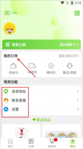 1. 开启清美云超,其涵盖首页、分类、购物车、我的等板块。在首页,既能进行搜索,又能直接查看商品。