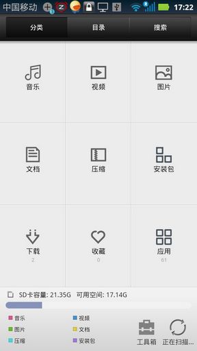 按照用户习惯管理文件分类,音乐、图片、视频、安装下载文件管理一目了然,文件可以按照日期,文件名,大小,扩展名等多种方式排序。删除,新建,复制,剪切,重命名等文件操作功能一应俱全。可以通过蓝牙,邮件等发送分享文件,更有一键设置桌面背景,一键设置铃音功能。设置默认打开应用让您能够轻松选择使用自己最喜欢的应用打开多媒体文件。我们还提供的便捷地管理已经安装应用的功能。内置图片浏览器,视频播放器,文档阅读器。
