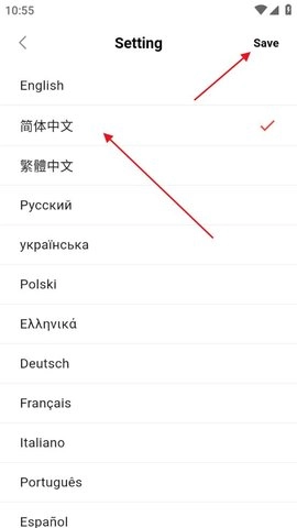 3、来到语言选择界面,点击【简体中文】,接着点击右上角的【Save】完成切换。