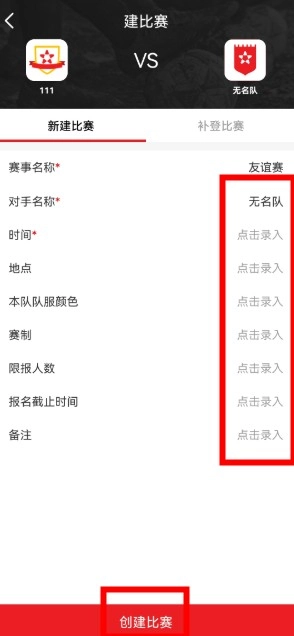 在全新的比赛页面中录入赛事详情,随后点击“创建比赛”按钮即可完成操作。