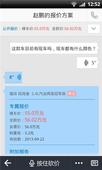 4、语音砍价:向当地汽车4S店销售顾问匿名发起砍价,语音、文字沟通随心所欲;