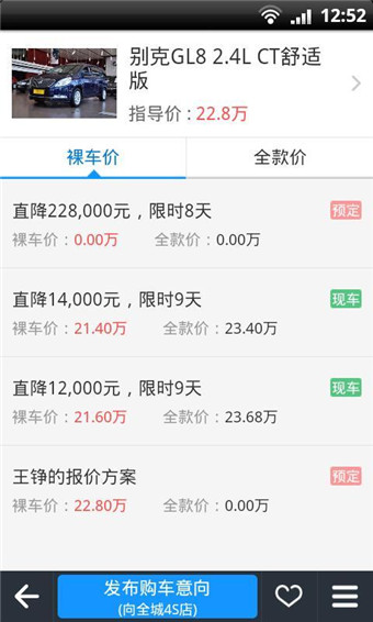 3、底价购车:一对一砍价太麻烦?发布您的心理购车价格,全城汽车4S店为您提供购车报价方案;