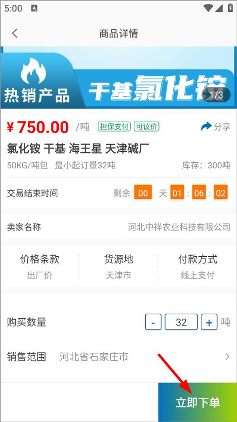 3、当用户进入化肥详情页面后,能够查看化肥的价格、库存、货源地以及销售范围等信息,之后点击“立即下单”。
