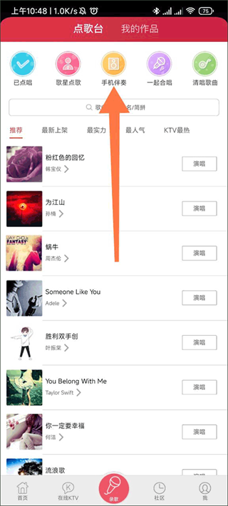 2、接着在点歌台界面的顶端点击手机伴奏。