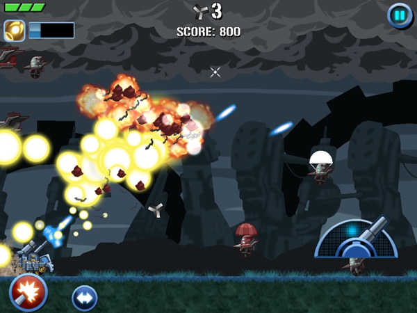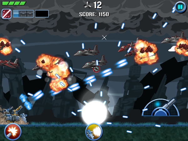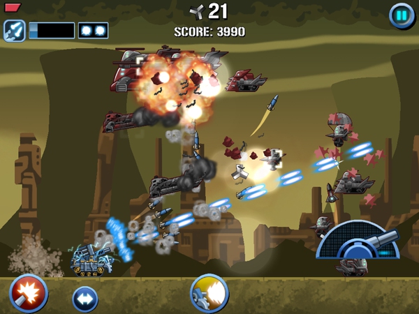 暴力坦克安卓版似乎是无尽模式,为了让一路冲杀的过程保持新鲜感,游戏提供了丰富的升级系统和多样的敌人。在升级界面中,玩家能对坦克的耐久度、主武器、副武器、超级武器进行解锁和升级,升级的道具在游戏中可收集。可装备副武器一共有 4 种,每种都有自己的攻击特点,在游戏中可进行灵活的切换,武器发射方向跟随主武器移动。而超级武器就是放出像“暴雨梨花针”一样的弹丸进行全屏攻击。商店提供副武器和超级武器的弹药,不过,副武器的弹药可在游戏中收集。坦克的对手种类也十分的丰富,有会空投地面单位的运输机、会轰炸的攻击机、会进行自杀式爆炸的飞行机器人、还有发射地地导弹的导弹车等等。每种敌人都会有加大尺寸,越大越耐揍,进攻方式也更强,掉落的升级道具更多,算是在无尽的冲杀中加入的 BOSS。