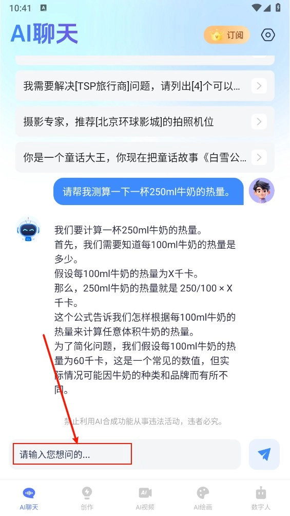 2、开启软件,进入“AI聊天”板块,输入你想要询问的问题,即可获得自动回答。