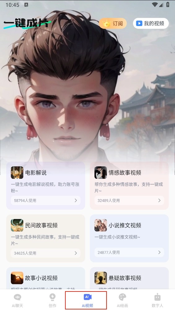 4、接下来,打开“AI视频”板块,即可开展电影解说、民间故事、情感故事等内容的创作,并能一键生成成片。