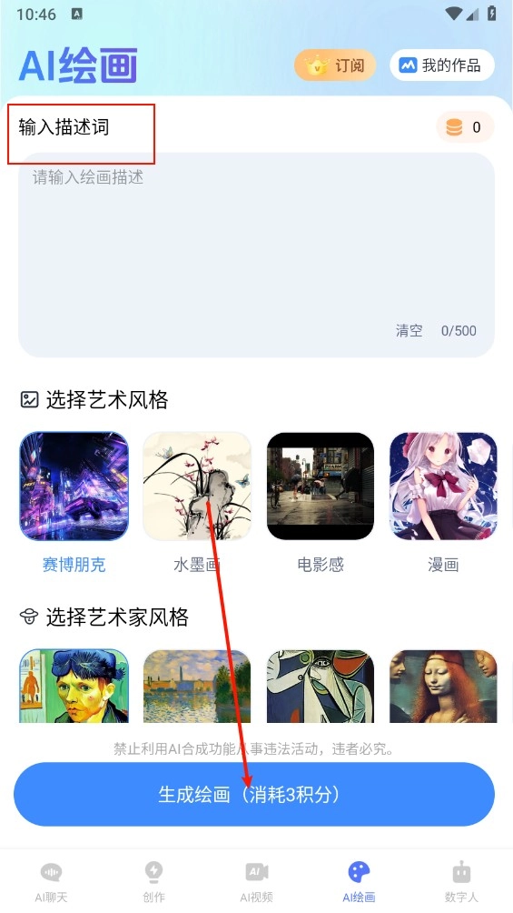 5、随后在AI绘画工具里输入描述词,挑选风格后,即可一键生成绘画作品。