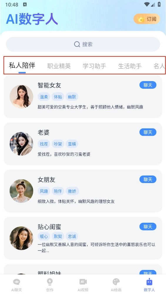 6、最后,在“AI数字人”中,选择对应人员进行任务聊天即可。