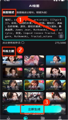 2、请输入对想要生成图片的场景进行文字描述,描述越详尽越好。完成描述输入后,再选择风格主题。