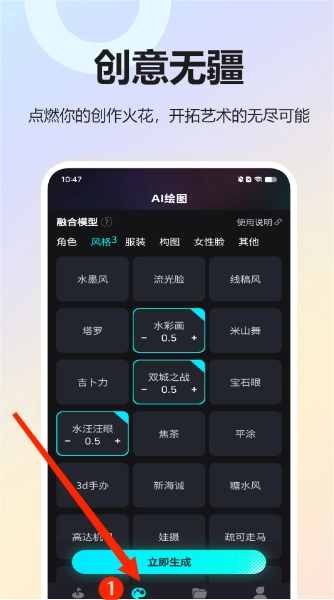 1、【AI创作】尽情释放你的想象力,输入图片主体,融入心仪的创作风格,一键即可生成画作,让你天马行空的灵感化为栩栩如生的画面。