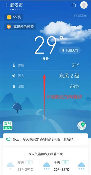 1. 在彩云天气预报软件主界面,用户只需从屏幕下方向上滑动,把页面拉至最底部,就能查看详情内容。
