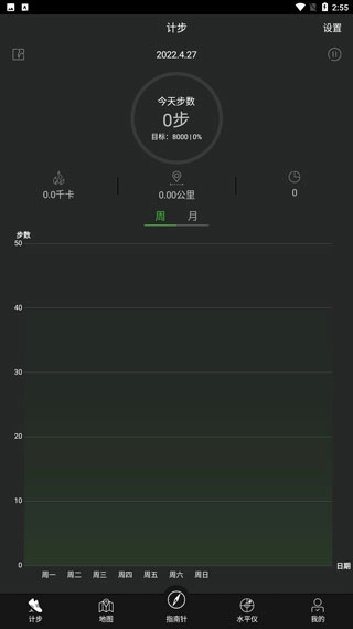 可记录每日,每周,每月步数,可设定目标完成度。可记录热量消耗,公里数和时间,万能计步器!