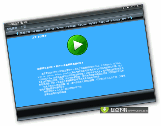 1st极品直播是基于聚合技术的P2P网络直播软件,。提供了目前最流行的PPlive、PPStream、QQLive、MOP itv、Mysee、TVkoo、SopCast,沸点电视,蚂蚁电视,优度等P2P网络电视核心引擎。还开辟了FlashMtv、Flash小品、Flash游戏等栏目。作为一款新的产品,1st极品直播2007不仅仅是传统意义上的PP电视大全,她采用先进的封装技术,具有稳定简易的安装、卸载、维护和修复功能,并对集成的解码器组合进行了尽可能的优化和兼容性调整。同时,海量且不断更新的影视资源更是她的魅力所在.
