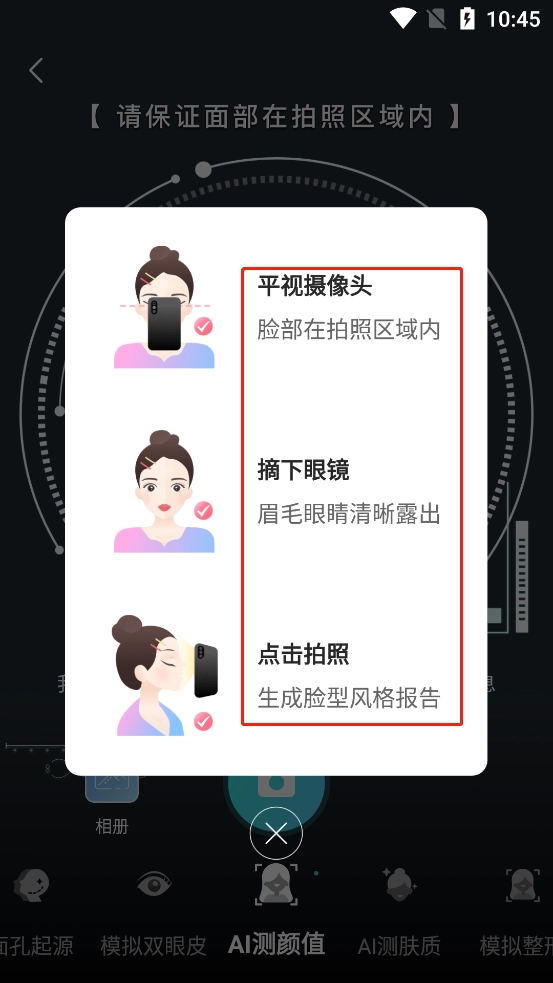 4、智能测脸功能,助你精准了解自身颜值,美丑与否,一测即明。