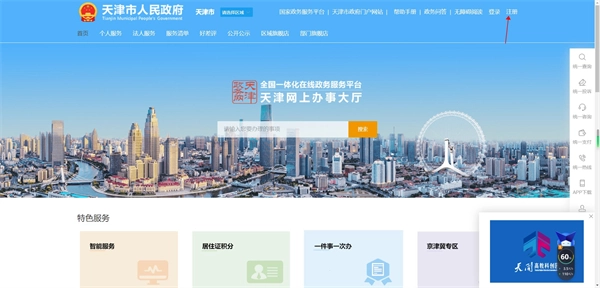 3、在电脑上输入“天津网上办事大厅”,进入该平台后,点击“注册”按钮。