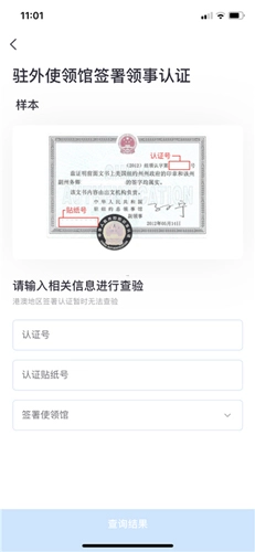 申请人在【领事认证查验】业务模块中输入领事认证号、贴纸号以及签署机关等相关信息,就能对国内及中国驻外使领馆所签发的领事认证的真伪进行查验。