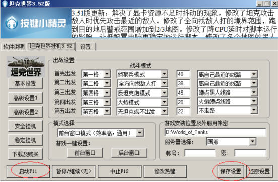 坦克世界挂机脚本基于按键小精灵制作,所以它非外挂,为玩家省掉许多繁杂的操作。坦克世界挂机脚本现在已免费使用,有任何问题,先看看脚本文件夹中的图文说明,新版的图文说明更详细。把脚本设置成窗口模式,显示脚本的操作,游戏也窗口模式,再开启脚本,看看脚本的操作。