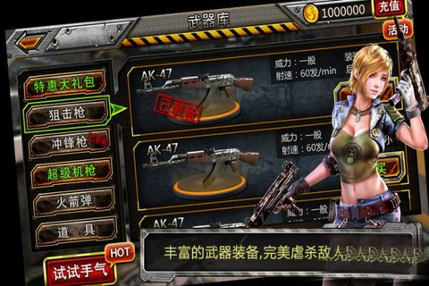 -三种剧情、五类武器、八大关卡,流畅的操作、丰富的武器系统、智能敌人调节系统、以及玩家可升级属性系统-全面的武器系统: 囊括了从手枪,冲锋枪到狙击枪的整一套枪械系统,让你体验玩转各种枪械的快感