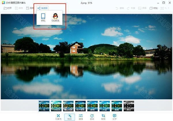 3)在图片美化窗口的左上角,点击“发送到”选项,就能直接分享给QQ好友。